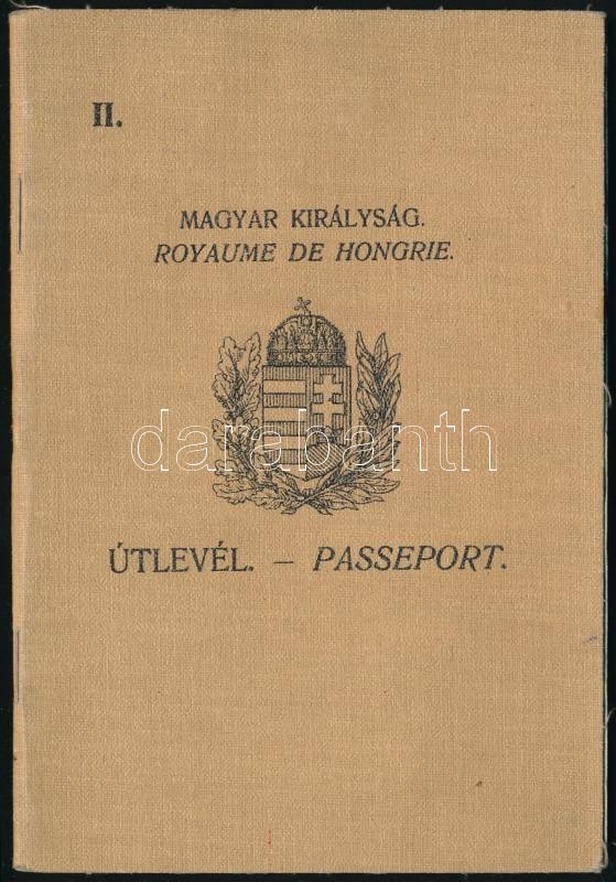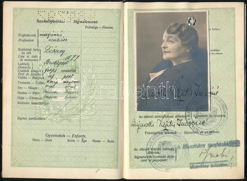 1935-1937 Magyar Királyság fényképes útlevele bajmoki Vadja Imréné Labdsberger Erzsébet, Landsberger Izidor gabonakereskedő lánya (Landsberger-bérház), bajmoki Vajda Imre pesti zsidó származású bankár, korábban a Magyar Kereskedelmi Rt. igazgatója, felesége részére szóló útlevél, benyomott 5 P és 5 P okmánybélyeggel, pecséttel, aláírásokkal.