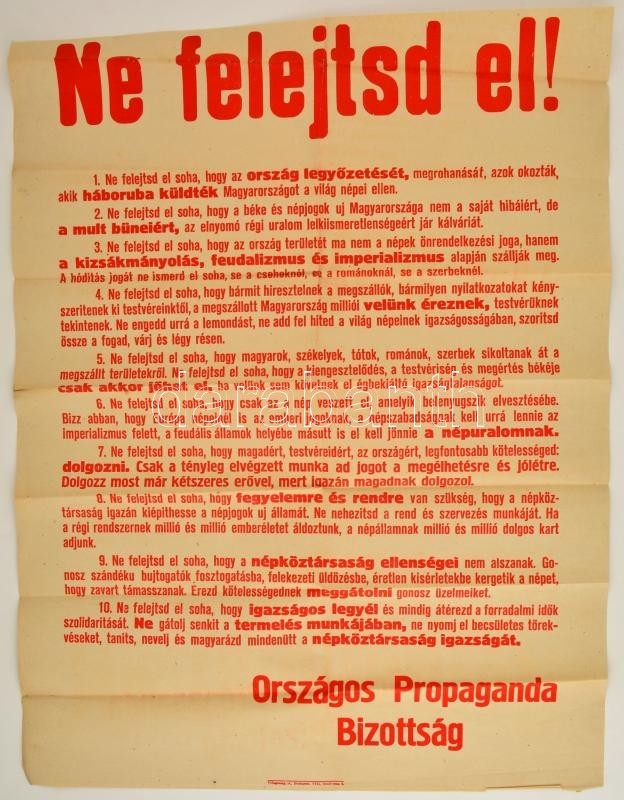 1918 Ne felejtsd el! Népköztársasági propaganda plakát, irredenta szöv... https://www.darabanth.com/hu/361-Gyorsarveres/361.0/Mutargy-papirregiseg-egyeb/Plakat~500034/1918-Ne-felejtsd-el-Nepkoztarsasagi-propaganda-plakat-irredenta-szoveggel-59x67-cm~II2084955