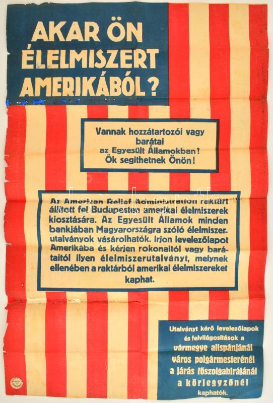 Leírás: cca 1910 Akar Ön élelmiszert Amerikából? American Relief Fundation propaganda plakát. 60x90 cm Ragasztott.