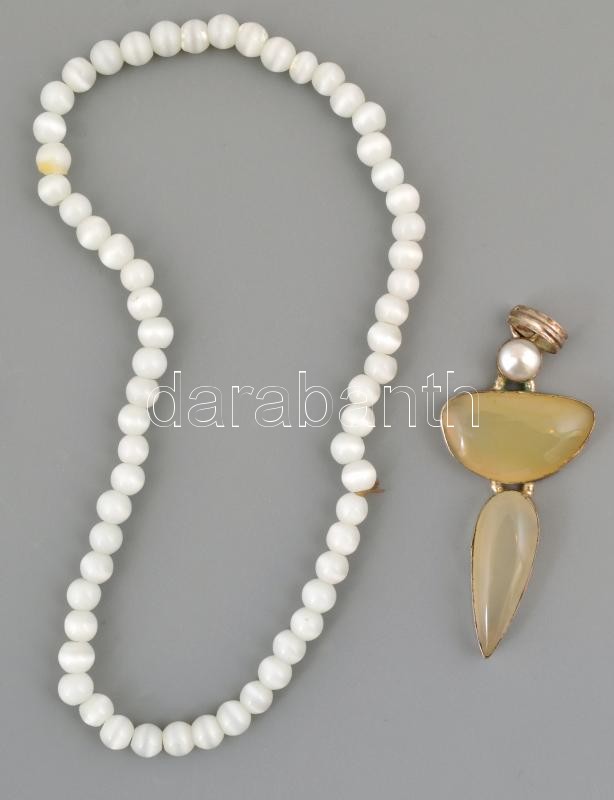 Leírás: Tenyésztett gyöngy nyklánc + achát köves ezüst medál. Jelzett.