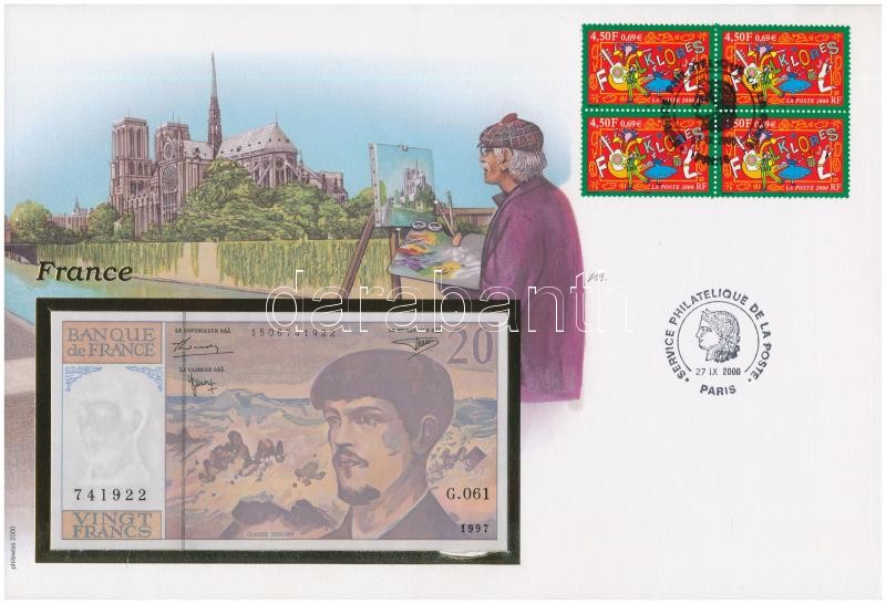 ... https://www.darabanth.com/hu/361-Gyorsarveres/361.0/Numizmatika/Ermes-es-bankjegyes-boritekok~2000004/Franciaorszag-1997-20Fr-felbelyegzett-boritekban-belyegzessel-TI--France-1997-20-Francs-~II2075130