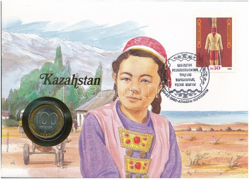 Kazakhstan coin envelope with stamp and cancellation with Russia 1992. 100 Roubles coin, with German language description C:UNC