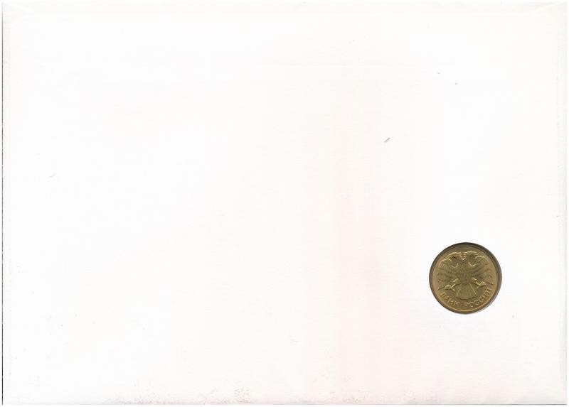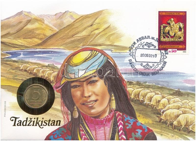 Tadzikistan in envelope with stamp and cancellation with Russia 1992. 5 Roubles coin, with German language description C:UNC