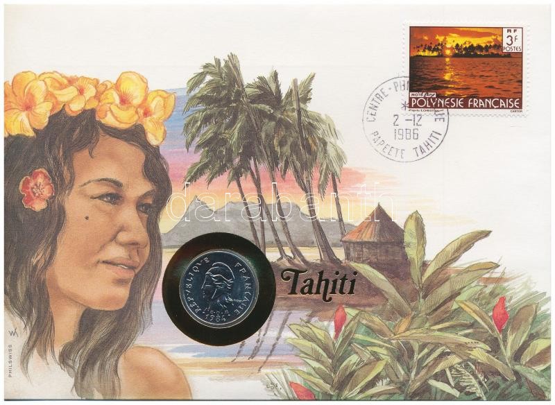 Tahiti 1984. 10 Francs in envelope with stamp and cancellation, with German description C:UNC