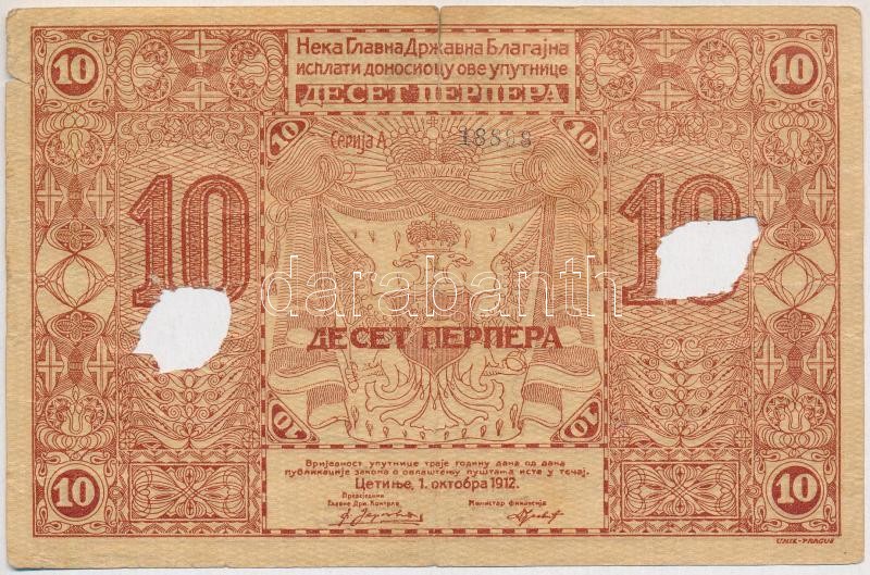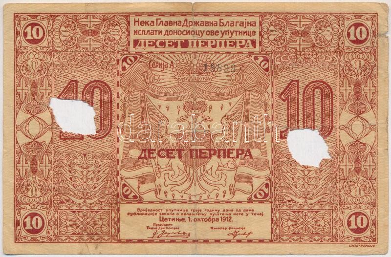 Montenegro ... https://www.darabanth.com/hu/361-Gyorsarveres/361.0/Numizmatika/Kulfoldi-bankjegyek~2000013/Montenegro-1912-10P-lyukasztassal-ervenytelenitve-TIII--Montenegro-1912-10-Perpera-cancelle~II2083232