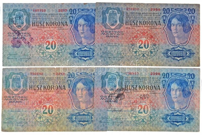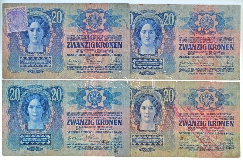 1913. 20K (4xklf) nehezen olvasható, cirill betűs felülbélyegzésekkel, egyik jugoszláv bélyeggel T:III / Hungary 1913. 20 Korona (4xdiff) with hardly readable cyrillic cancellations, one with Yugoslavian stamp C:F