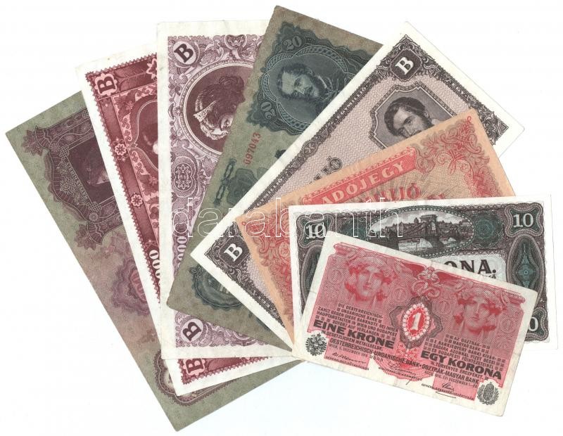 Leírás: 8db-os vegyes korona és pengő tétel, közte fordított címeres 1.000.000AP T:II--III-