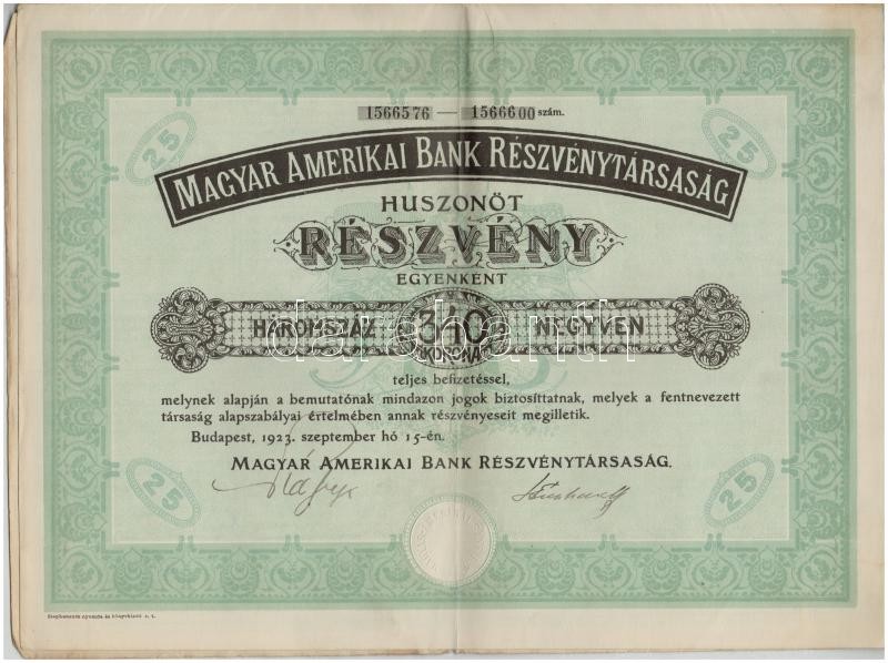 Leírás: Budapest 1923. "Magyar Amerikai Bank Részvénytársaság" 25 részvénye egyenként 340K-ról, szelvényekkel és szárazpecséttel T:II-,III
