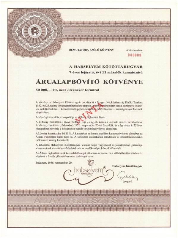 Budapest 1985. "A Pest Megyei Iparcikk Kereskedelmi Vállalat" kötvénye 10.000Ft-ról + Budapest 1986. "A Habselyem kötöttárugyár" Árualapbővítő kötvénye 50.000Ft-ról + Debrecen 1987. "A Magyar Gördülőcsapágy Művek" csapágy kötvénye 500.000Ft-ról, mindhárom "000000"-ás sorszámmal T:I