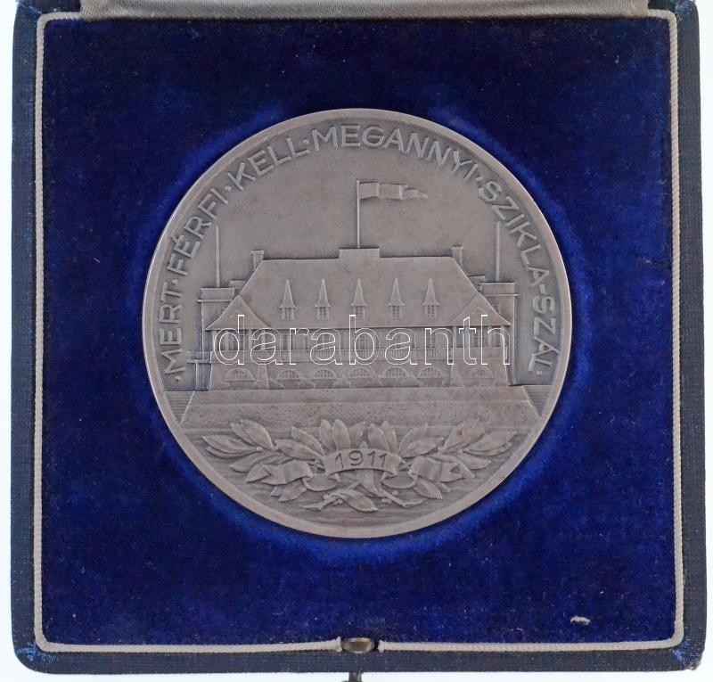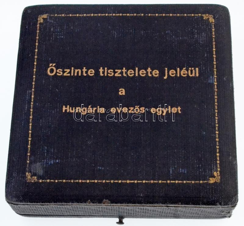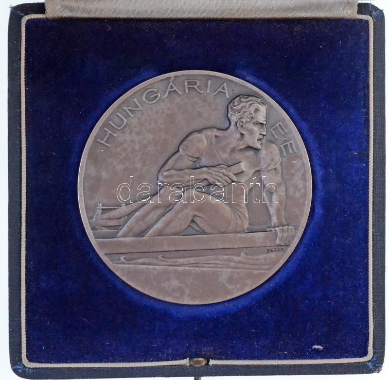 Berán Lajos (1882-1943) 1938. "HUNGÁRIA EE / MERT FÉRFI KELL MEGANNYI SZIKLA SZÁL 1911" Hungária Evezős Egylet ezüstözött Br emlékéreme, eredeti "BERÁN NÁNDOR IPARMŰVÉSZ DÖBRENTEI U. 2." jelzésá gyártói tokban, külső oldalán aranyozott felirat "ŐSZINTE TISZTELETE JELÉÜL A HUNGÁRIA EVEZŐS EGYLET" (71mm) T:1-