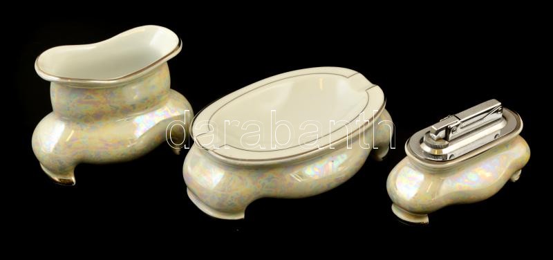 Leírás: Jelzés nélkül: porcelán dohányzó készlet. irizáló mázfestéssel. Apró kopásokkal.