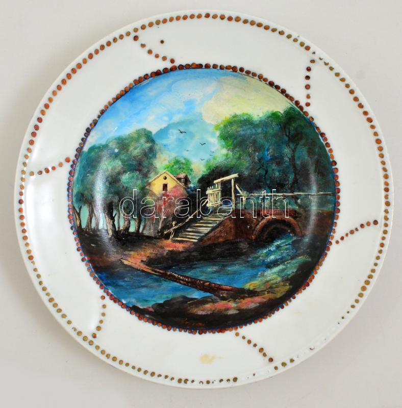 Leírás: cca 1900 Kézzel festett fali dísztál, jelzett (Rónai), kopott, d: 30,5 cm