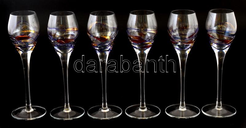 Leírás: Dekoratív iparművész üveg pohárkészlet, 6 db, apró kopásokkal, m: 19 cm