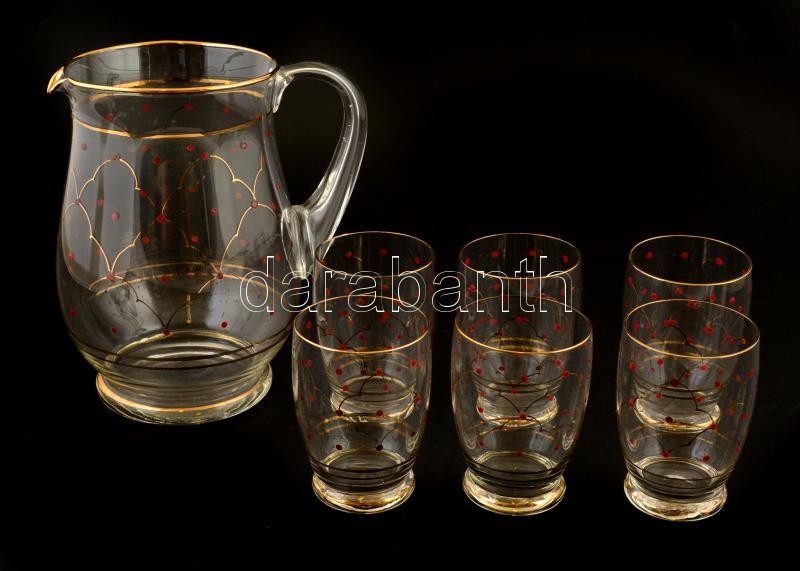 Leírás: Kézi festésű üveg kancsó vizes poharakkal 6 + 1 db
