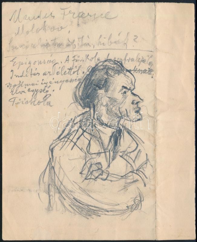 Leírás: Bencze László ( 1907-1992): Pór Bertalan (a tanár). Ceruza, papír, jelzett (a hátoldalán), hajtott, 16×10 cm