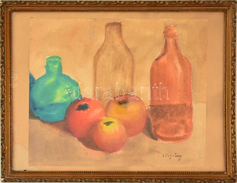 Leírás: Czigány jelzéssel: Asztali csendélet. Akvarell, papír, üvegezett keretben, 30×37 cm