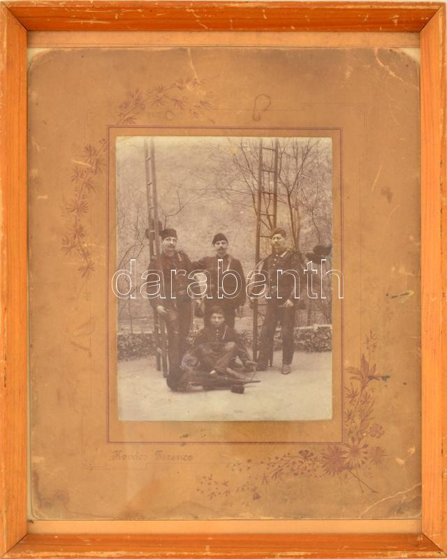 Leírás: cca 1900 Kéményseprők, kartonra kasírozott fotó, üvegezett keretben, 15×11 cm