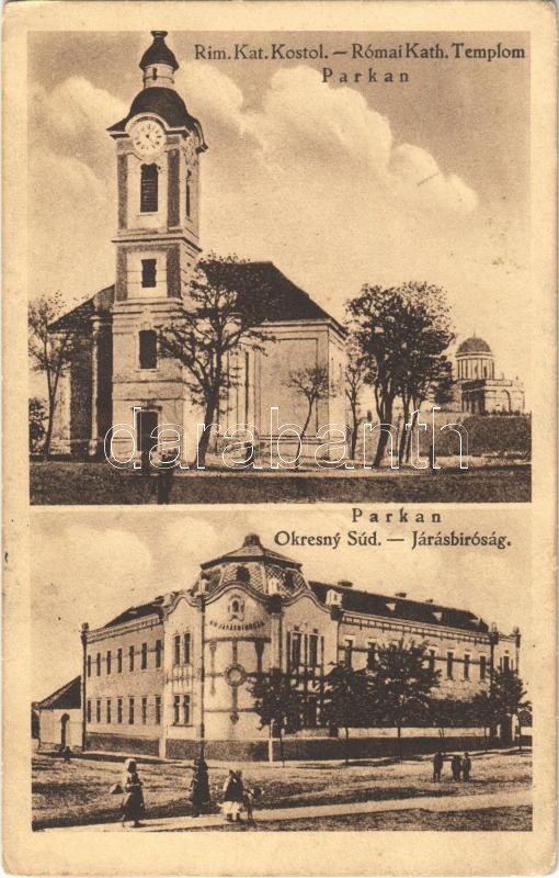 1938 Párkány, Parkan, Stúrovo; Rim. Kat. Kostol, Okresny Súd / Római katolikus templom, Járásbíróság. Gondos Vilmos kiadása / Catholic church, district court (EK)