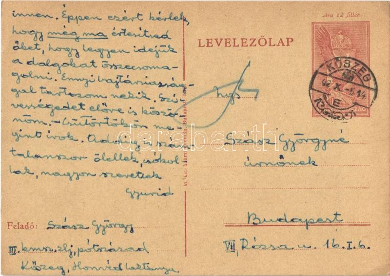 1942 Szász György zsidó III. KMSZ zlj. pótszázados (közérdekű munkaszolgálatos) levele feleségének Szász Klárának a kőszegi munkatáborból / WWII Letter of a Jewish labor serviceman to his wife. Judaica