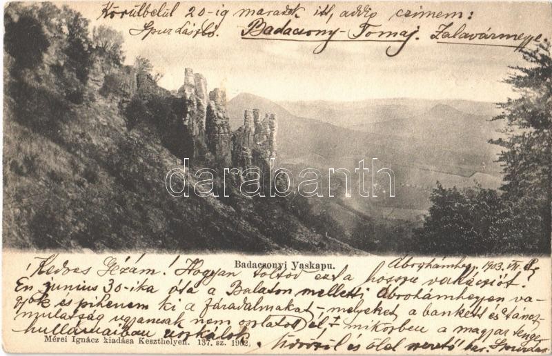 Leírás: 1903 Badacsony, Badacsonyi "Vaskapu", Kőkapu, bazaltoszlopok. Mérei Ignác kiadása 137. sz.