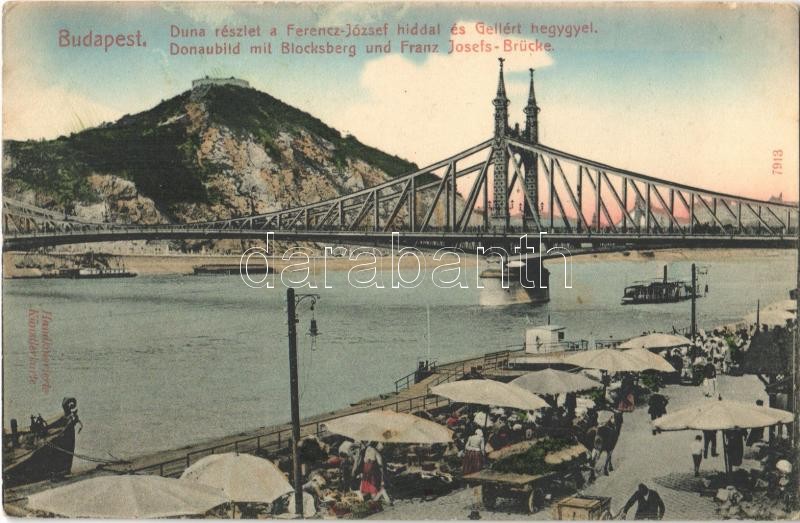 Leírás: Budapest, Duna, Ferenc József híd, Gellért-hegy, piac a pesti rakparton. Taussig A. 7913.