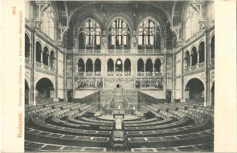 Budapest V. Országház, ülésterem, belső. Taussig A. 9832. https://www.darabanth.com/hu/362-Gyorsarveres/362.0/Kepeslapok/Magyarorszag~1000005/Budapest-V-Orszaghaz-ulesterem-belso-Taussig-A-9832~II2091852