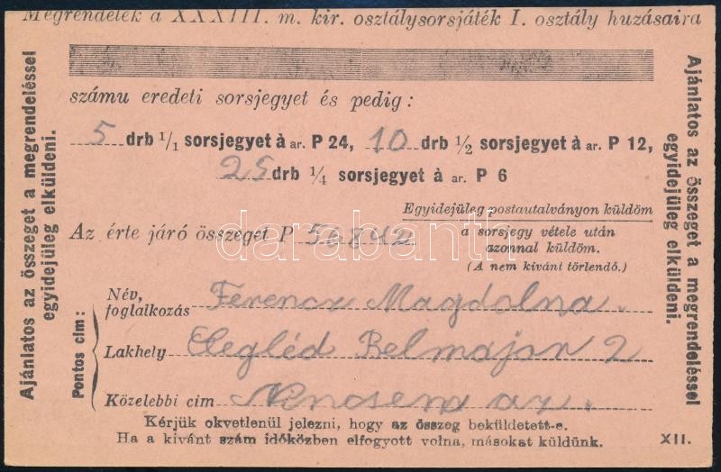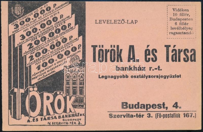 Leírás: 1931 A Török A. és Társa Bankház osztálysorsjáték húzásain résztvevő sorsjegyek megrendelési levelezőlapja
