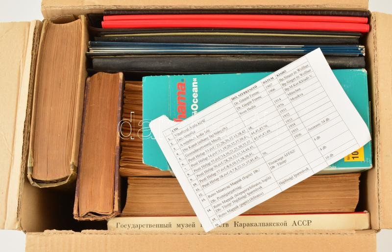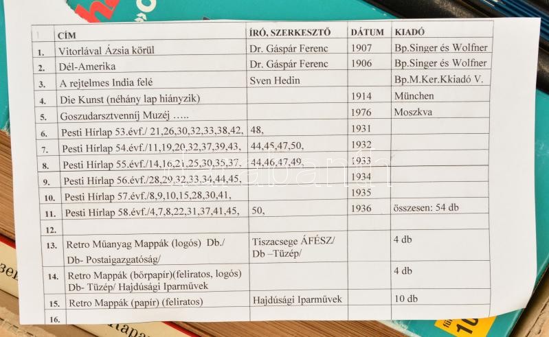 Nagy könyv és nyomtatvány tétel: benne utazási könyvek: Gáspár Ferenc, Sven Hedin A rejtelmes India felé, Pesti Hírlap kb 40 db száma 1931-1936 között, 18 db retro, feliratos, műanyag mappa