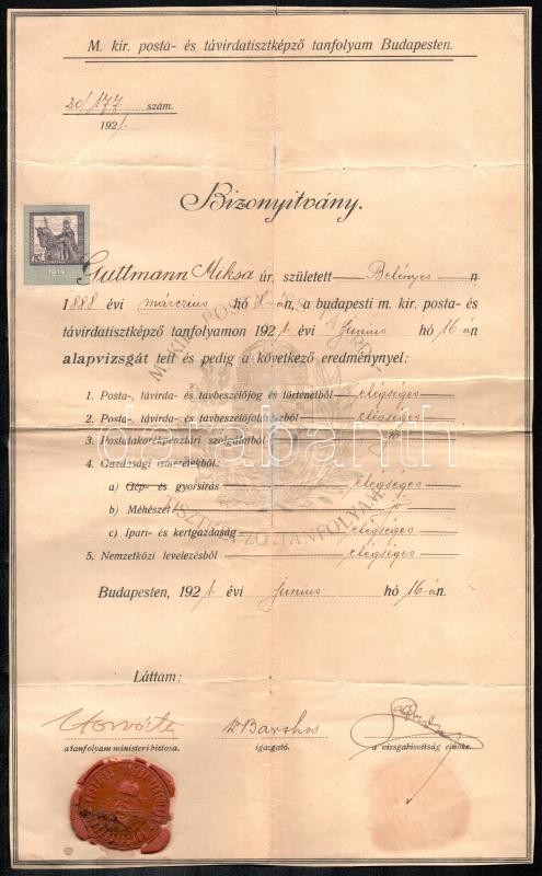 Leírás: 1921. Bp., M. Kir. Posta- és Távirdatisztképző által kiállított bizonyítvány, okmánybélyeggel, viaszpecséttel