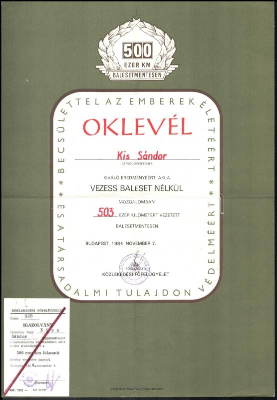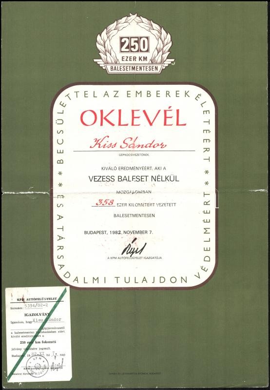 Leírás: 1982-1984 250 000 és 500 000 balesetmentes kilométer után adott oklevél és igazolvány