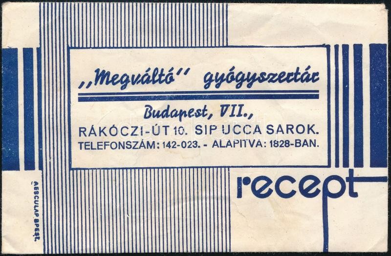 Megváltó Gyógyszertár Budapest VII. receptborítékja https://www.darabanth.com/hu/362-Gyorsarveres/362.0/Mutargy-papirregiseg-egyeb/Reklam~500022/Megvalto-Gyogyszertar-Budapest-VII-receptboritekja~II2089180