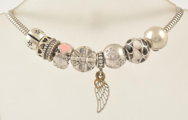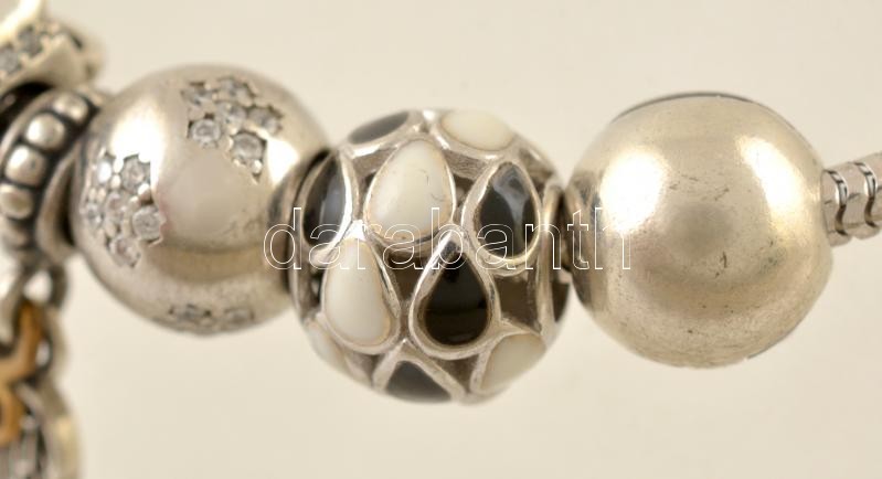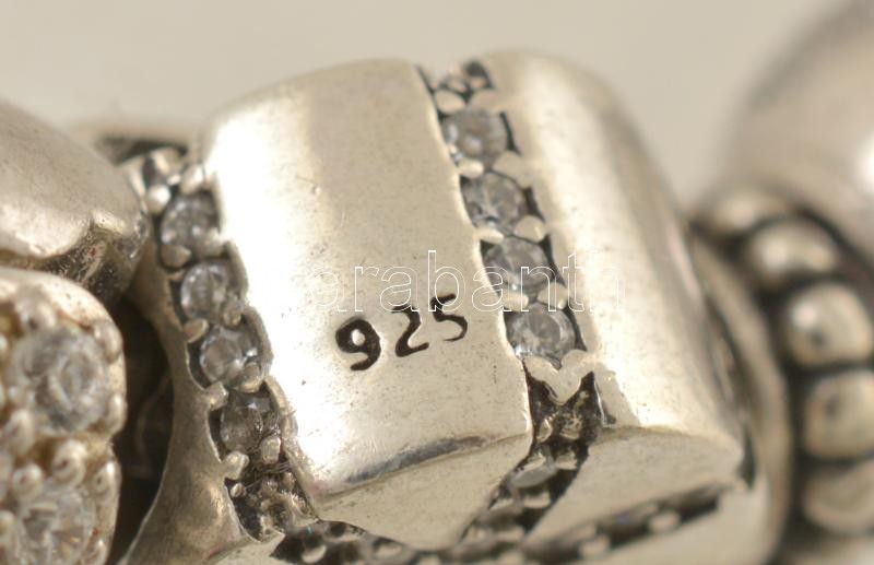 Leírás: Ezüst(Ag) karkötő, charmokkal, Pandora jelzéssel, h: 17,5 cm, bruttó: 26,2 g