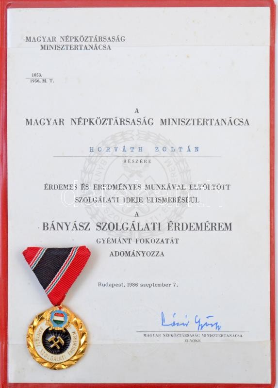 Leírás: 1984. "Bányász Szolgálati Érdemérem gyémánt fokozata" aranyozott Br kitüntetés mellszalaggal, adományozói okirattal T:2