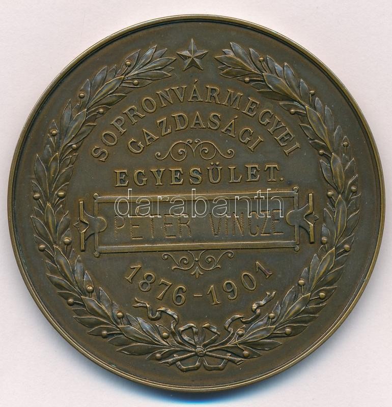 Leírás: 1901. "HASS ALKOSS, GYARAPÍTS S A HAZA FÉNYRE DERÜL / SOPRON VÁRMEGYEI GAZDASÁGI EGYESÜLET 1876-1901" kétoldalas Br emlékérem, hátoldalon gravírozva. Szign.: Adler Jakab (61mm) T:1-,2 felszíni karc