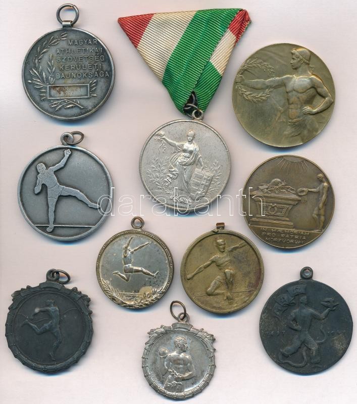 Vegyes 10db-os atlétikai díj és emlékérem tétel, közte több Magyar Athletikai Szövetség érem, valamint 1931. "MAGYAR ATHLETIKAI SZÖVETSÉG KERÜLETI BAJNOKSÁGA" jelzett Ag díjérem, mellszalag nélkül "K. MARATHON I. 1931" T:vegyes