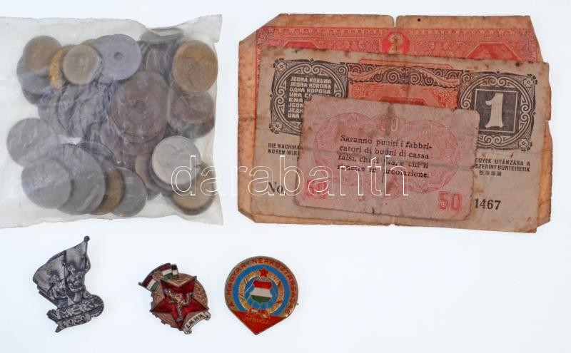 Leírás: Kis doboznyi vegyes bankjegy, jelvény és érme tétel, közte "A Magyar Népköztársaság Úttörője" T:vegyes