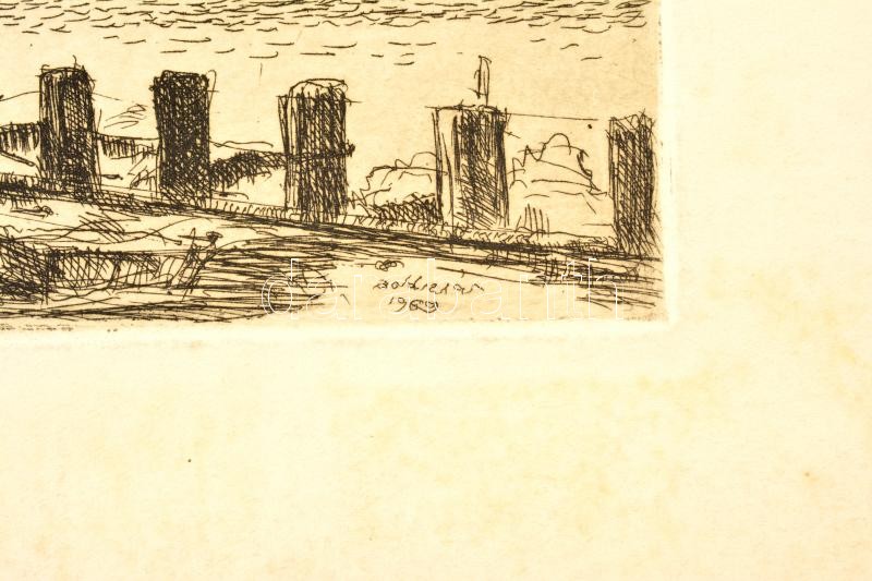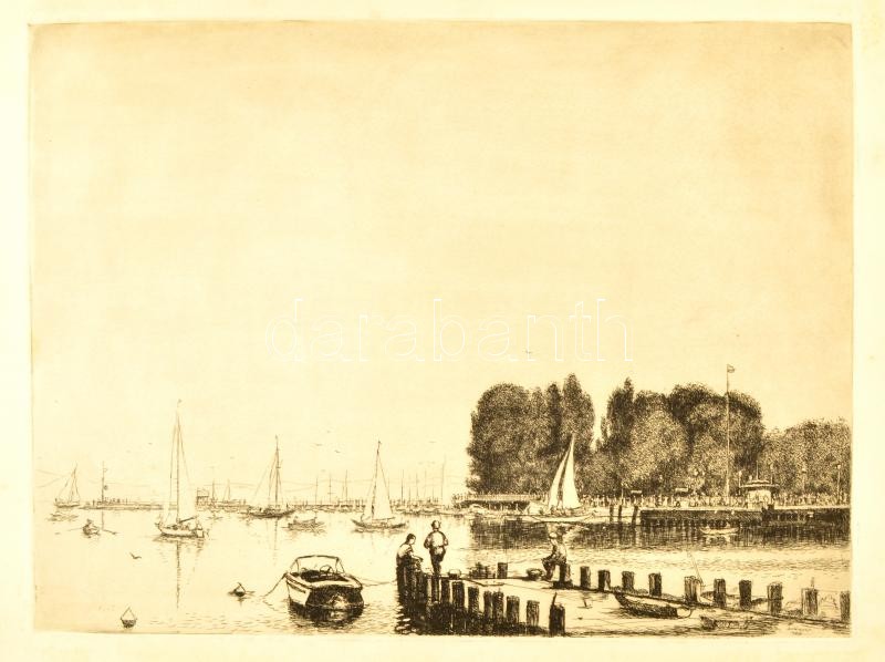 Leírás: Boldizsár István (1897-1984): Balatoni moló. Rézkarc, papír, jelzett (hátoldalán hagyatéki pecsét), 29×40 cm
