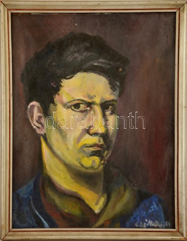 Leírás: Czeizek György (1953-1980): Önarckép. Olaj, papír, jelzett, üvegezett keretben, 30×23 cm