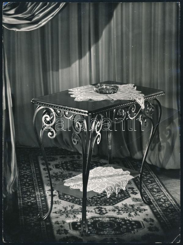 Leírás: Járai Rudolf (1913-1993): Fém asztal terítővel, pecséttel jelzett fotó, felületén törésnyommal, 24×18 cm
