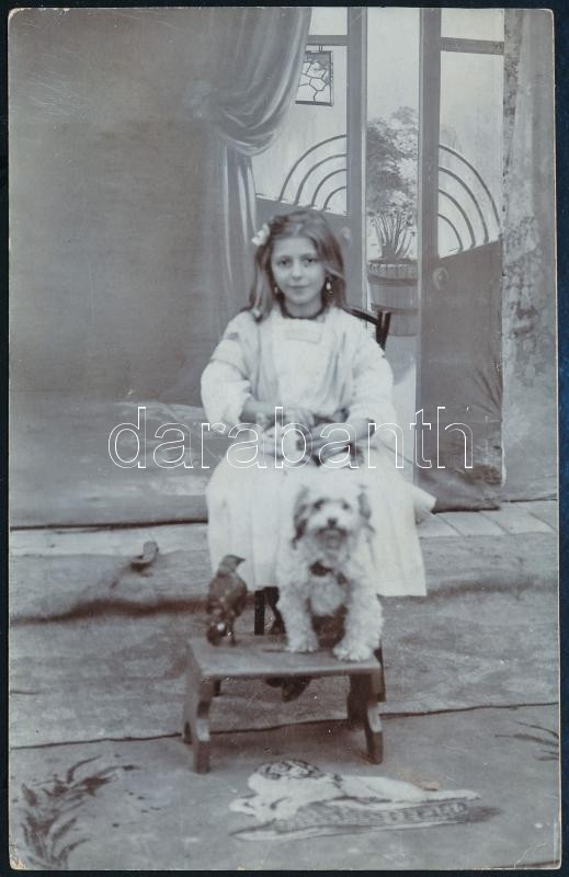 Leírás: cca 1900 Kislány, állatokkal. Fotólap