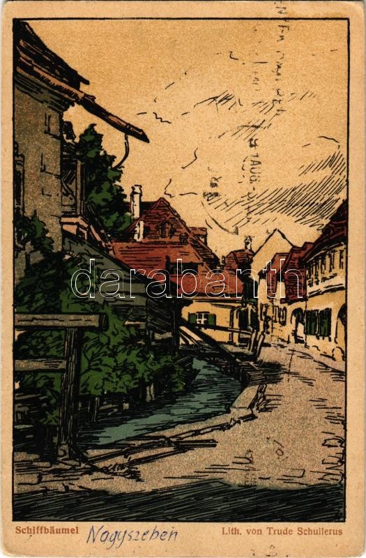 Leírás: Nagyszeben, Hermannstadt, Sibiu; Schiffbäumel / utcakép. Kraft & Drotleff A.-G. / street view, litho art postcard s: Trude Schullerus (EK)
