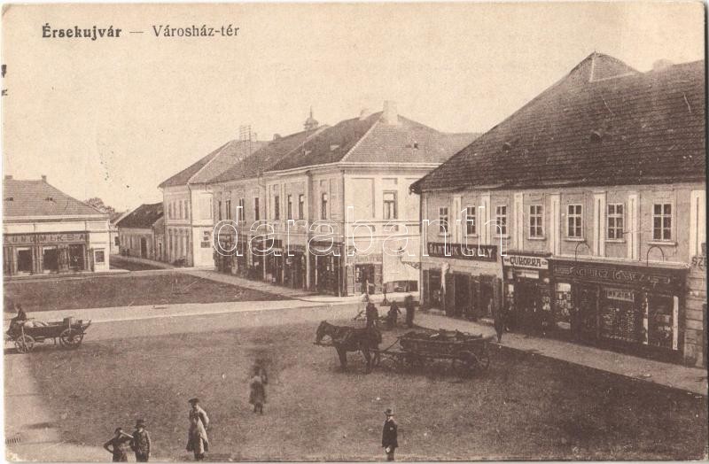 1918 Érsekújvár, Nové Zámky; Városház tér, Schulcz Ignácz, Cukorka, Bartlik Károly és Freund Miksa üzlete. 188. Vasúti Levelezőlapárusítás / square, shops