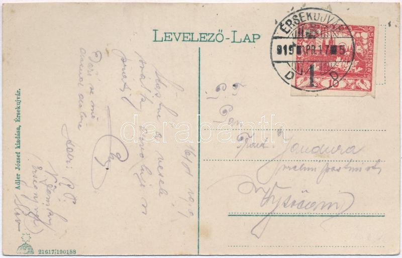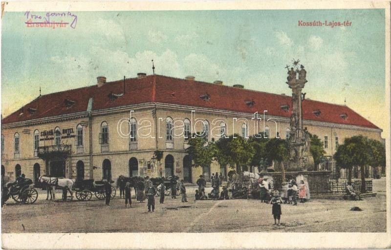 1919 Érsekújvár, Nové Zámky; Kossuth Lajos tér, Szentháromság szobor, Szálloda az Arany Oroszlánhoz. Adler József kiadása / square, Trinity statue, hotel (EK)