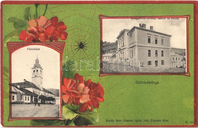 Leírás: Gölnicbánya, Göllnitz, Gelnica; Városháza, Szolgabírói hivatal, kaszinó és óvoda. Szecessziós pókhálós litho keret. Kiadja Matz Gusztáv Iglón / town hall, court, casino, nursery, kindergarten. Art Nouveau, floral, litho frame with spider web (EK)