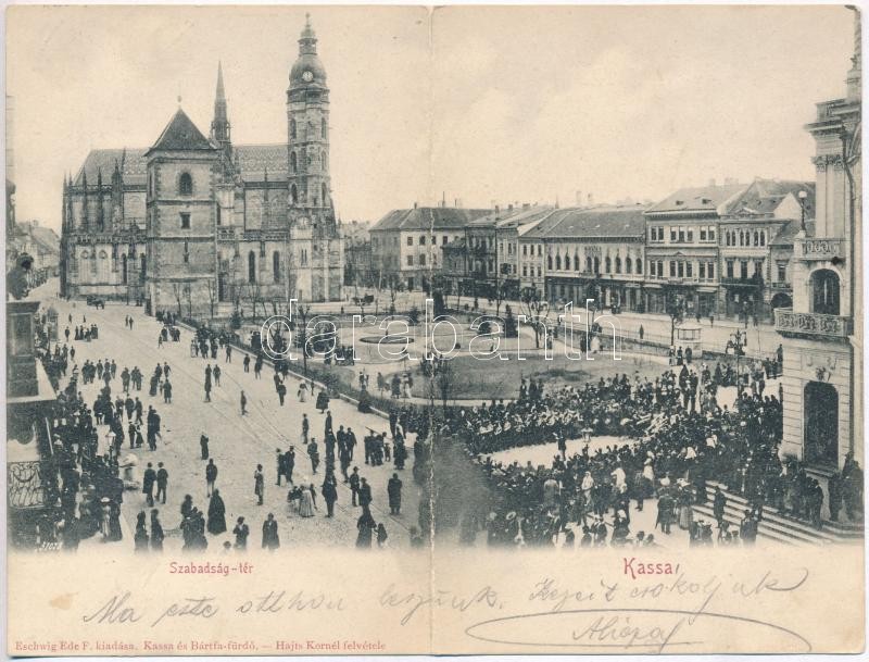 Leírás: Kassa, Kosice; Szabadság tér, üzletek, kihajtható képeslap, Hajts Kornél felvétele, Eschwig Ede F. kiadása / folding card, square, shops (hajtásnál szakadt / bent till broken)