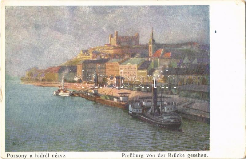 Leírás: Pozsony, Pressburg, Bratislava; Látkép a hídról / quay, steamships, castle. B.K.W.I. 386-4. s: Marx Béla