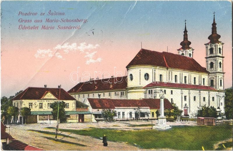 Leírás: Sasvár, Sastín, Mária Sasvár, Maria-Schlossberg; Kegytemplom, Karol Wallener vendéglője / church, restaurant (EB)