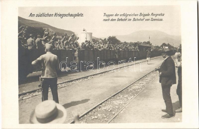 Szenice, Szenicz, Senitz, Senica nad Myjavou; A Pongrátz Brigád katonái hazatérnek a győztes csata után, vasútállomás / Am südlichen Kriegschauplatz. Truppen der erfolgreichen Brigade Pongratz nach dem Gefecht im Bahnhof / WWI K.u.K., soldiers of the Pongratz Brigade arriving to the railway station after a victorious battle. photo