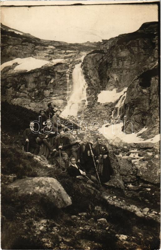 Leírás: Tátra, Magas Tátra, Vysoké Tatry; kirándulók a Fátyol vízesésnél (?) / Vodopád Skok (?) / hikers by the waterfall, tourists. photo