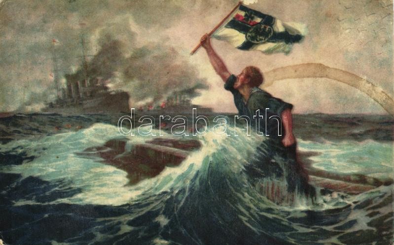 Leírás: Der letzte Mann. Kaiserliche Marine / WWI German Imperial Navy art postcard, Sea battle of the Falkland Islands s: Prof. Hans Bohrdt (worn corners)